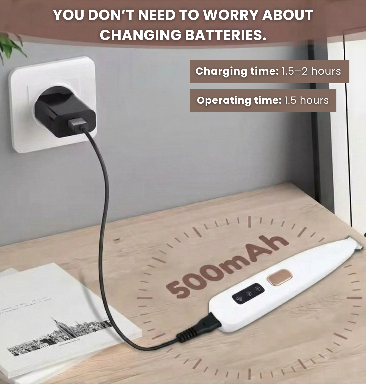 Quiet operation at around 35 dB, combined with an ergonomic and lightweight design, ensures a calm and comfortable grooming experience. The cordless 500 mAh battery provides up to 1.5 hours of use, and the waterproof construction makes cleaning after each session easy. Your pet stays relaxed and comfortable throughout the entire grooming session.